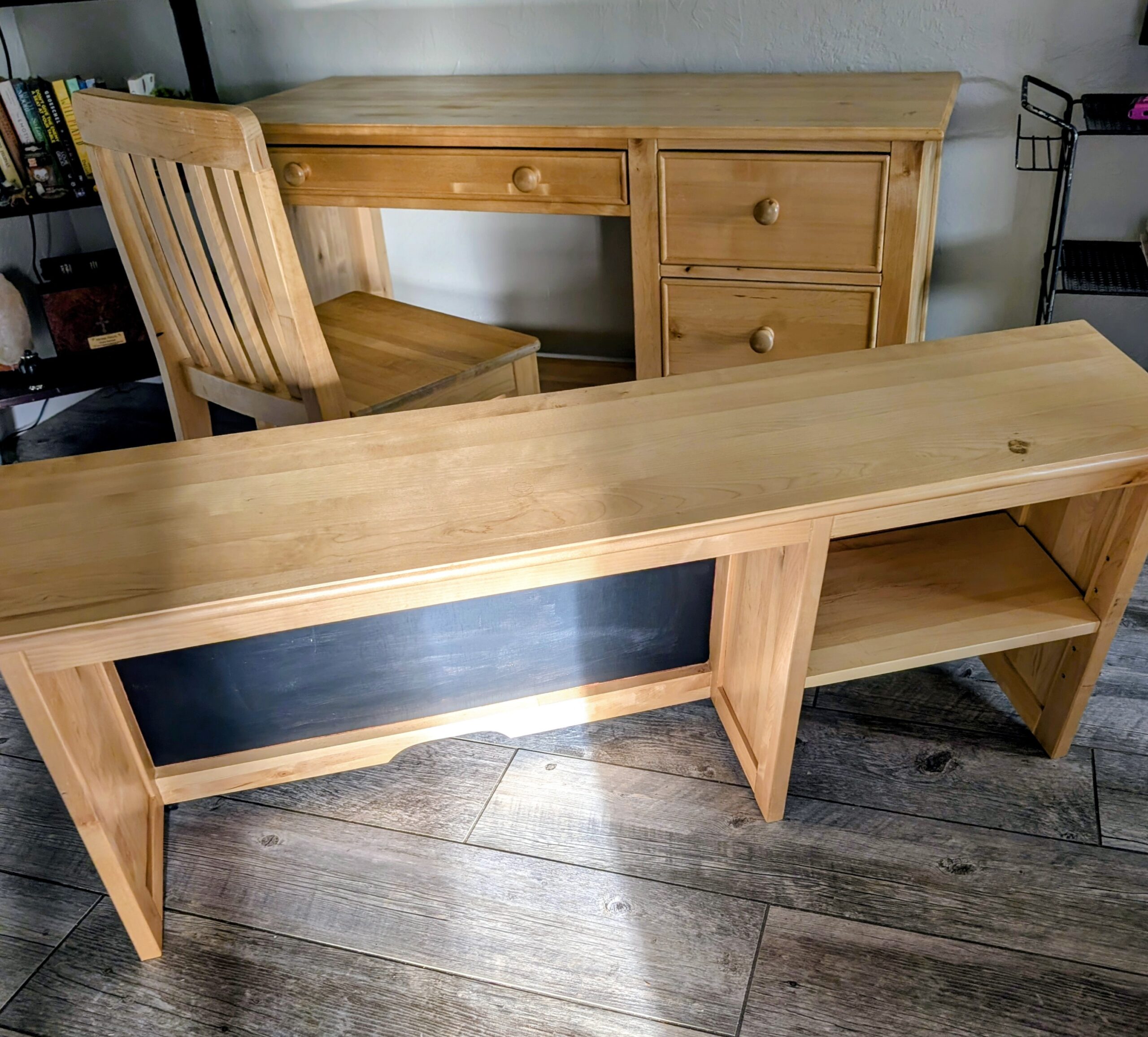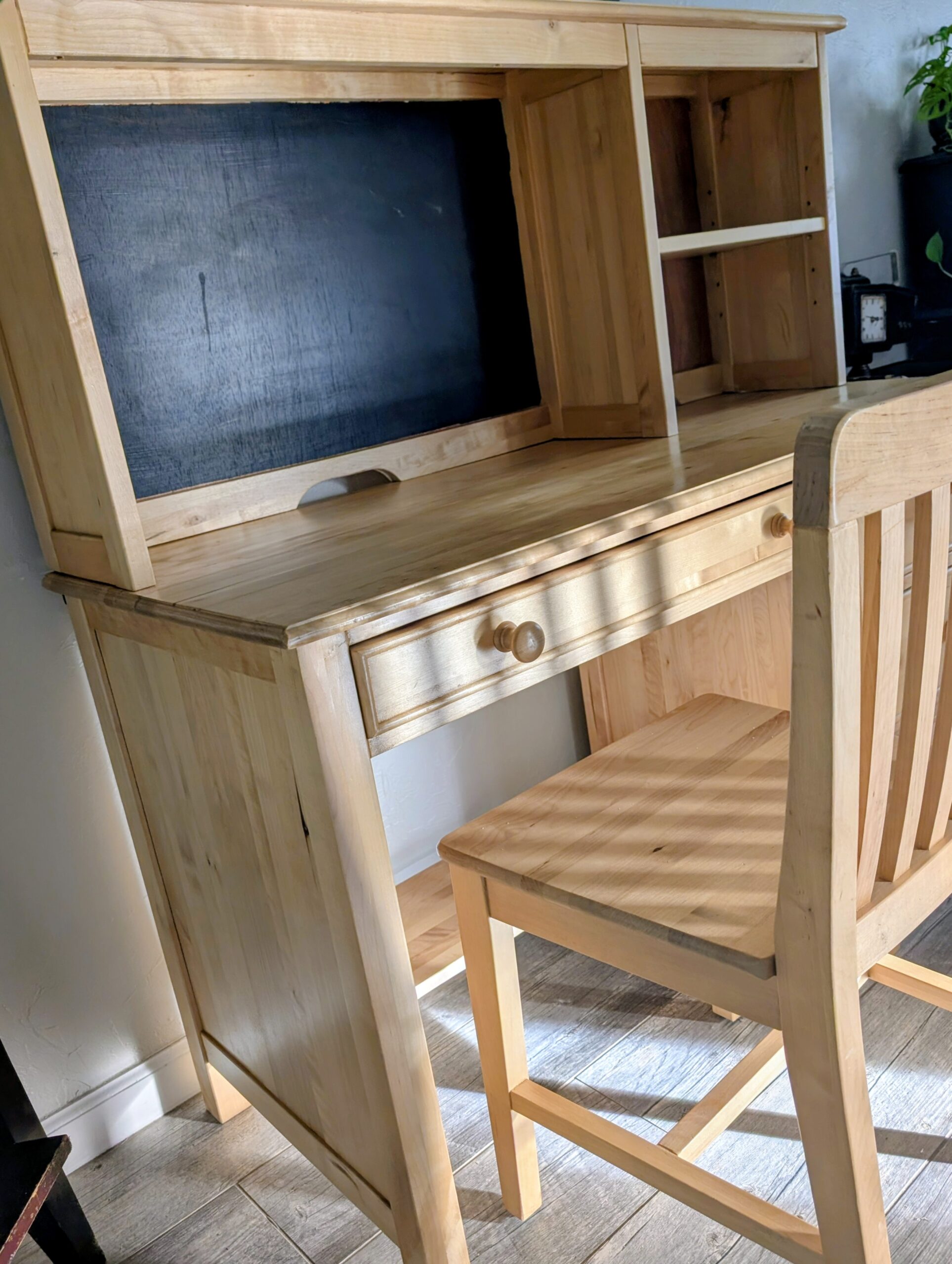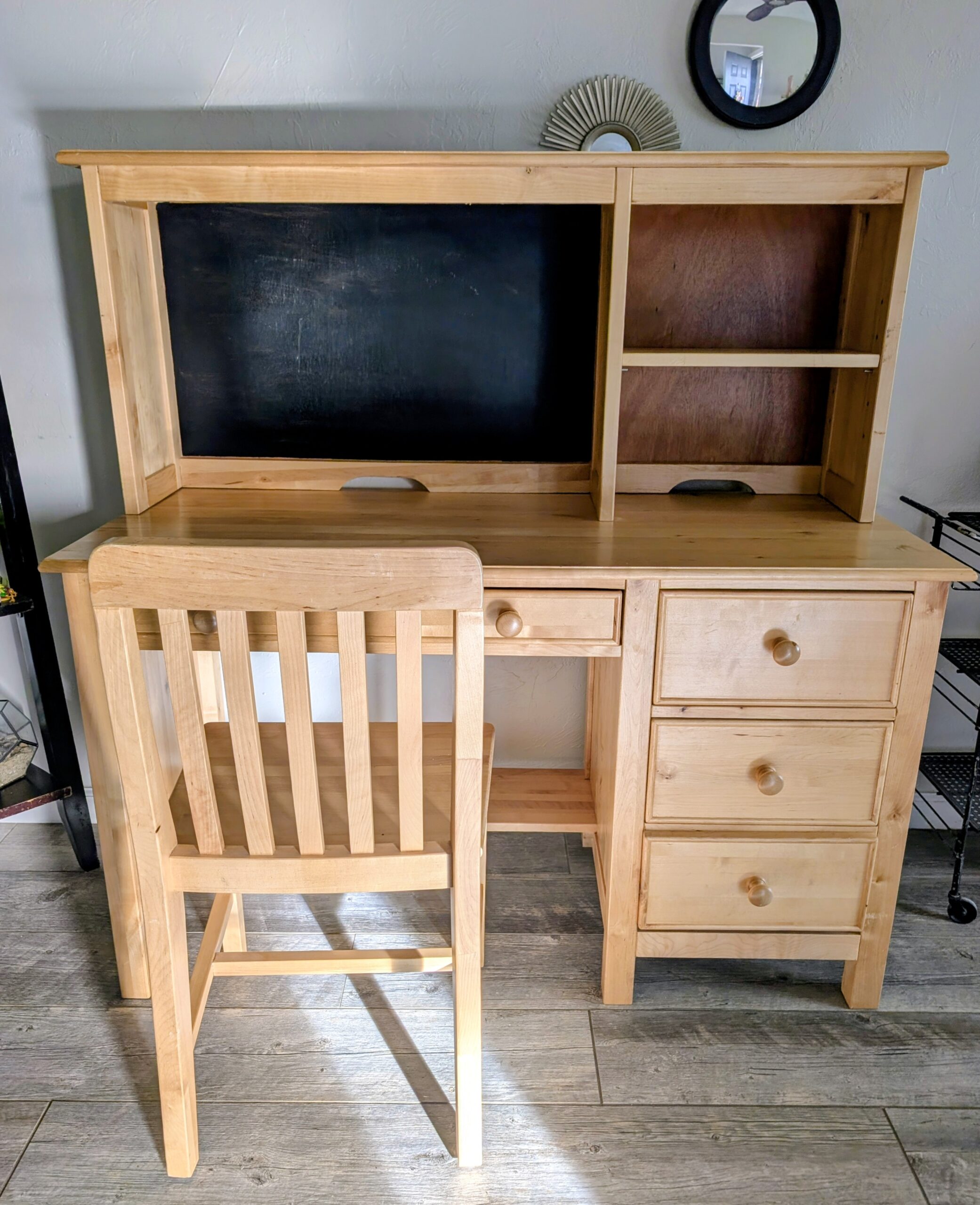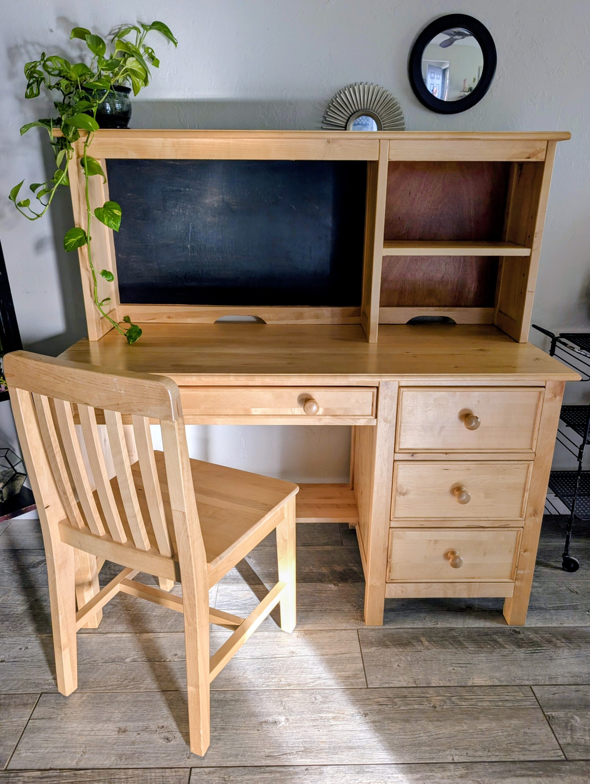 Beautiful vintage solid wood desk with matching hutch in a natural blonde finish. This piece has a clean timeless look that works perfectly for a home office homeschool setup or child’s room.